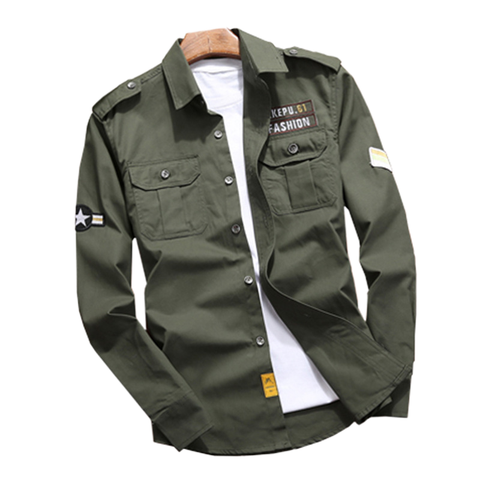 เสื้อทำงานแขนยาวสำหรับผู้ชายเสื้อเชิ้ตลำลองทรงหลวมมีกระเป๋าแบบย้อนยุคออกแบบได้ตามต้องการ