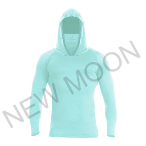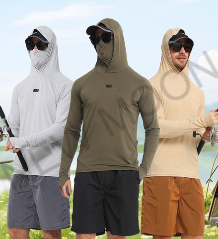 เสื้อตกปลาผ้าโพลีเอสเตอร์ผ้าไอซ์มีฮู้ดแห้งเร็วป้องกันรังสียูวีสำหรับผู้ชาย